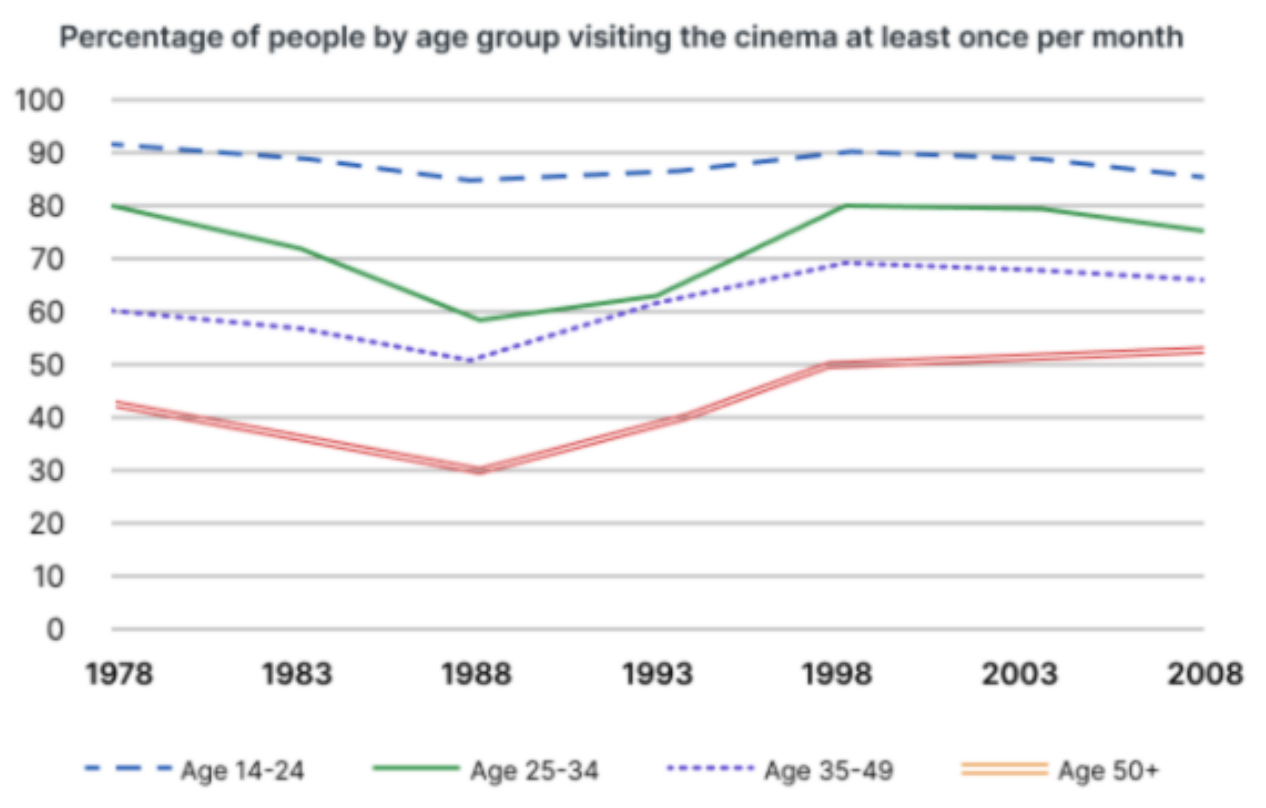 The provided line chart depicts the monthly cinema visitation rates among different age groups in a particular country from 1978 to 2008.