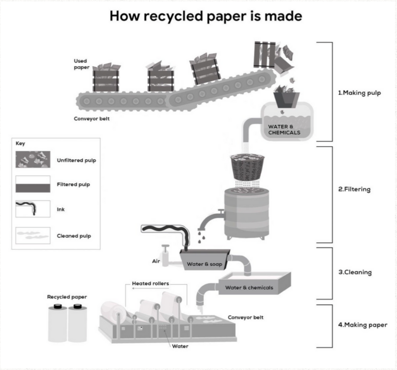 Overall, it can be seen that the process involves four main stages namely making pulp, filtering, cleaning and making paper. In addition, various equipment and chemicals are employed to enhance the materials throughout these stages.
